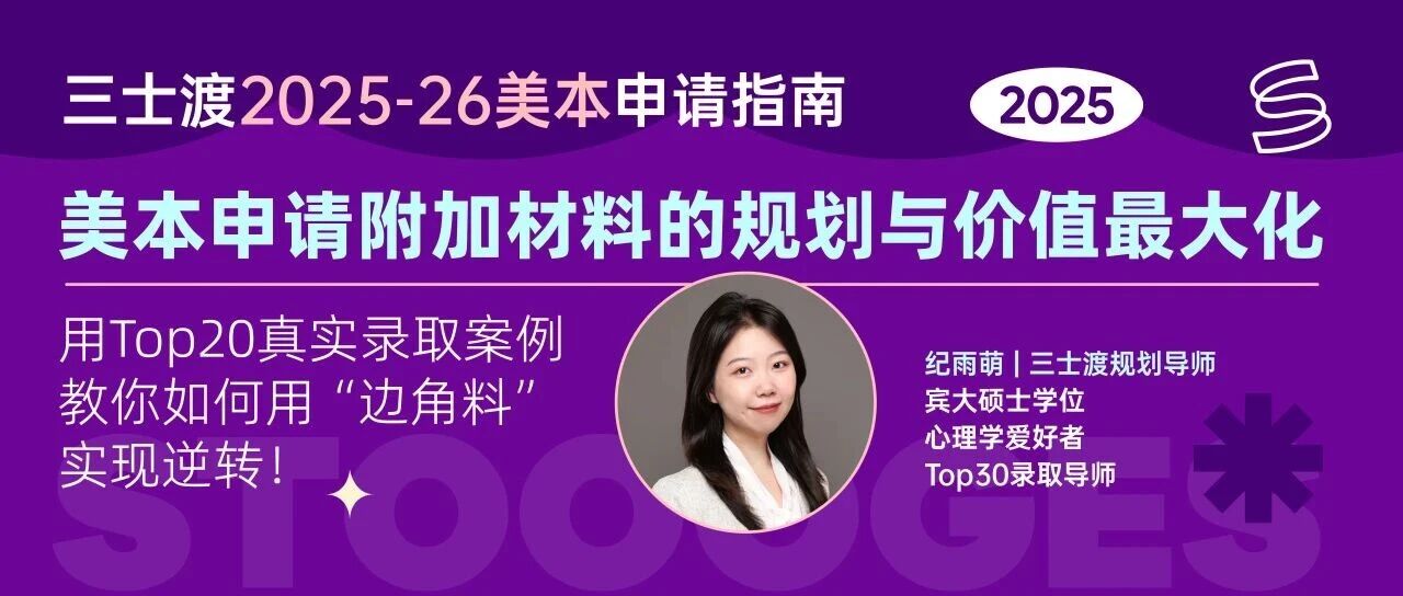 为此,我们特邀三士渡资深规划导师纪老师,⏰在本周五晚8点,带来一场针对【美本申请附加材料的精准规划】专项讲座!