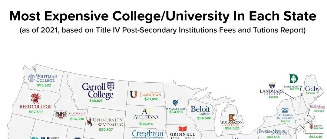 主页菌最近逛某书的时候看到一张图:美国各州最贵的大学,如下: