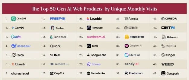 Suno(排名第 15) 在本次榜单中保持了与上一版相同的排名。